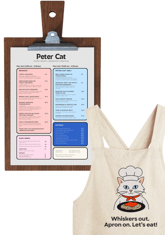 Peter Cat Café is a rebranding project for a well loved Malvern brunch spot. The new owner wanted the café to have a clearer personality, a stronger sense of community, and an identity that felt fresh and inviting for younger locals. Cwerky Studio developed a cohesive brand experience built around Peter Cat as a warm and charismatic chef who loves feeding the diverse people of Malvern.