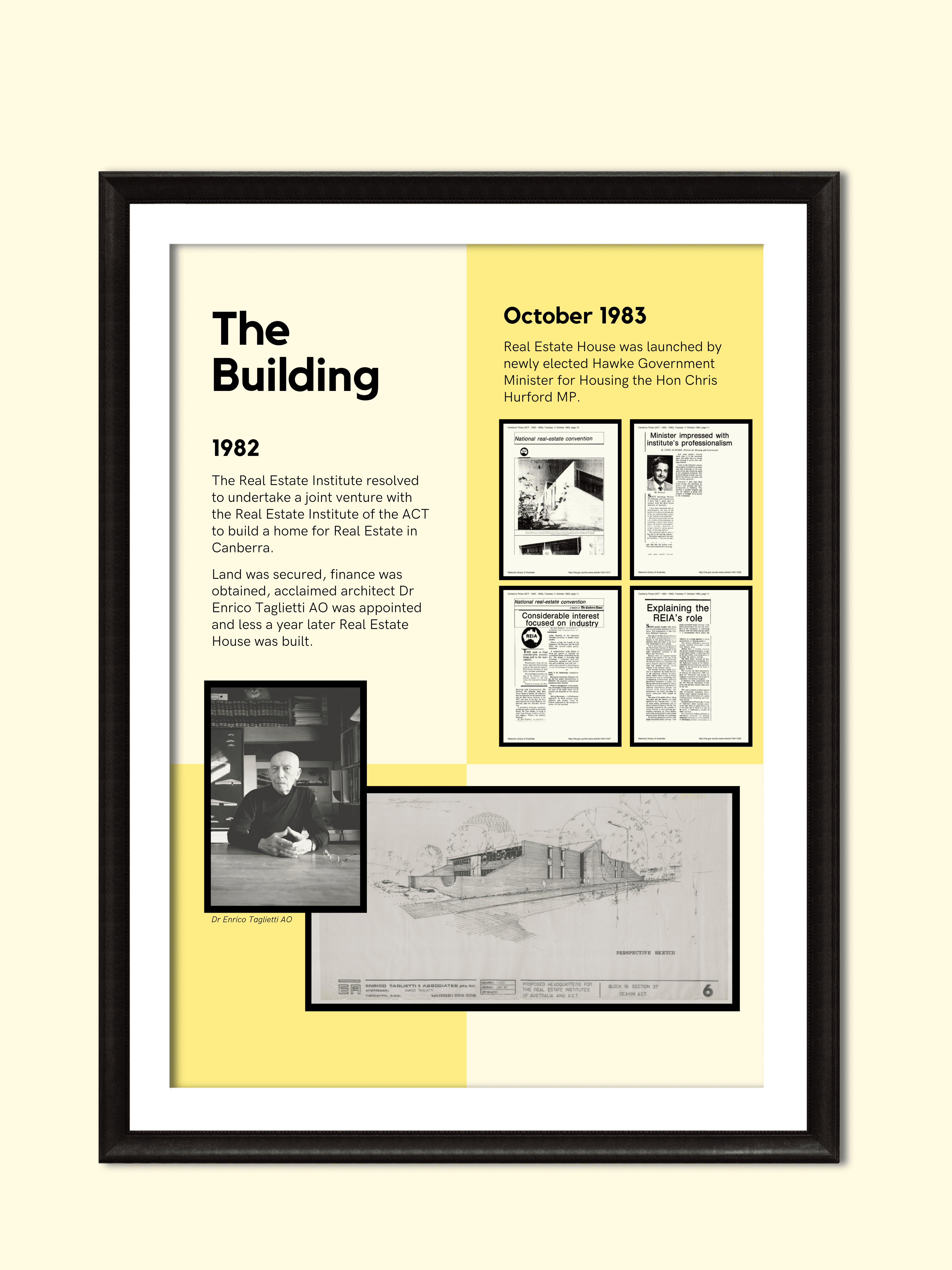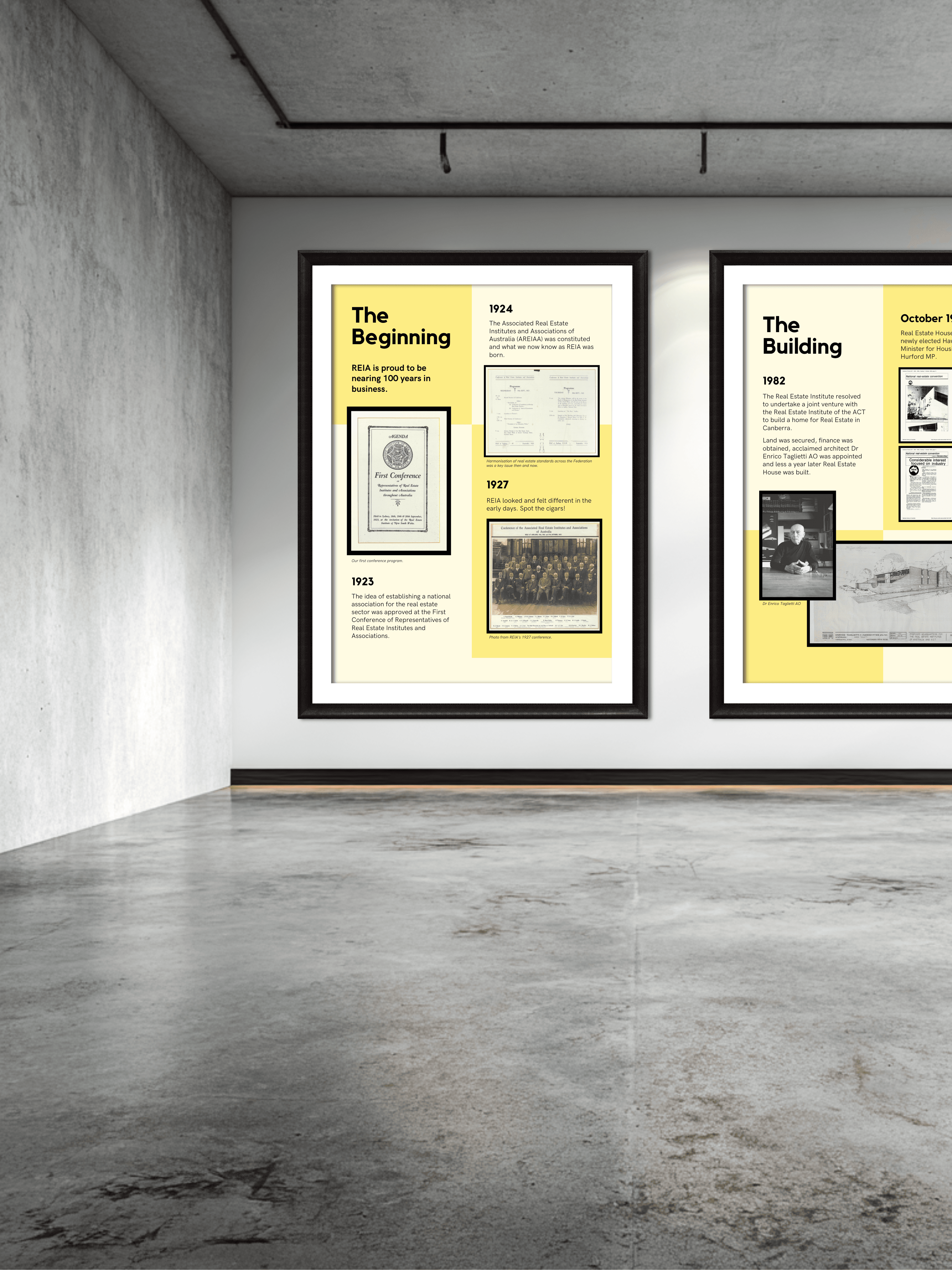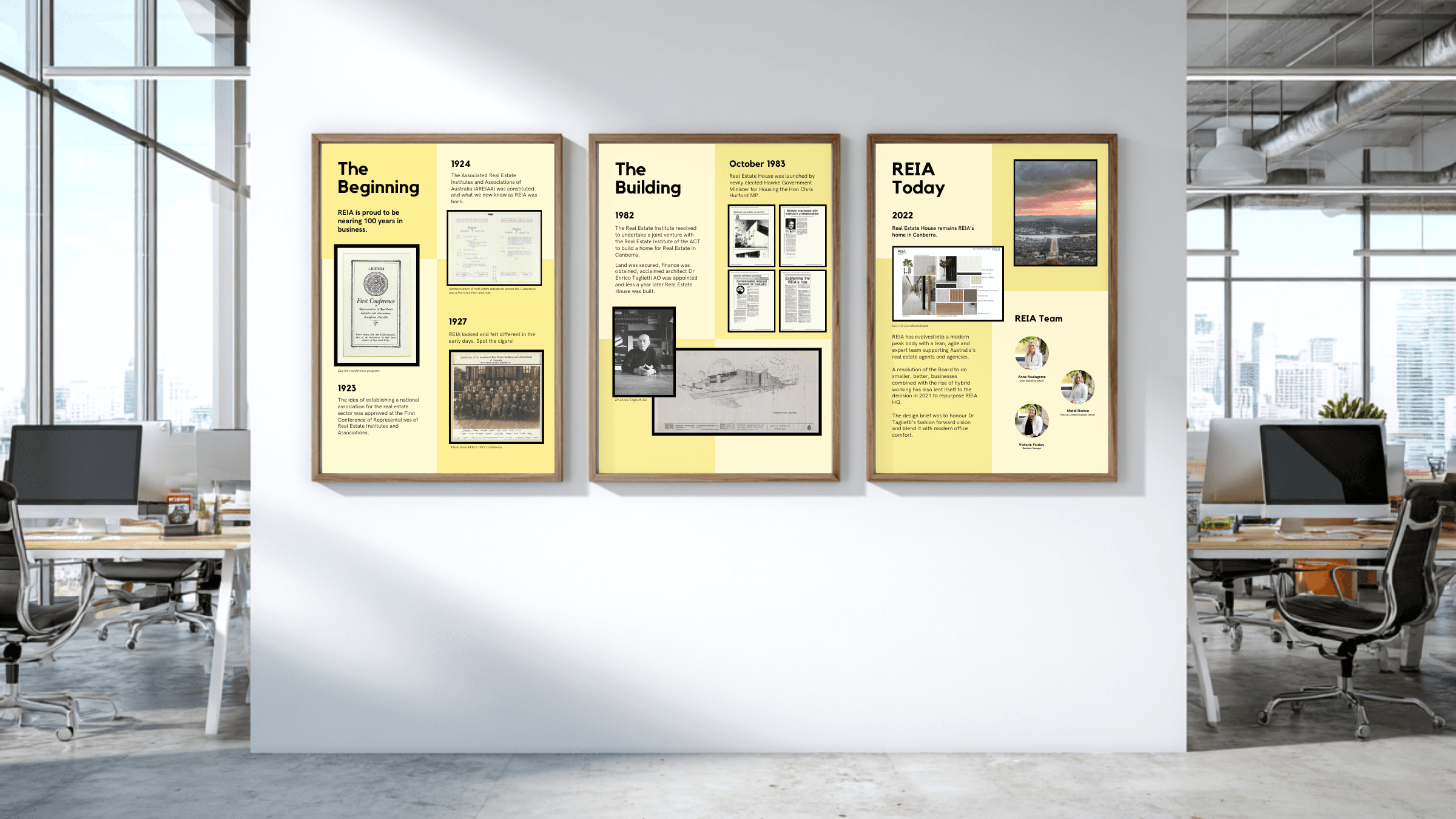 Designed to mark one hundred years of the Real Estate Institute of Australia, this wall installation documents REIA’s journey from its early beginnings to its present role as a modern national institution.